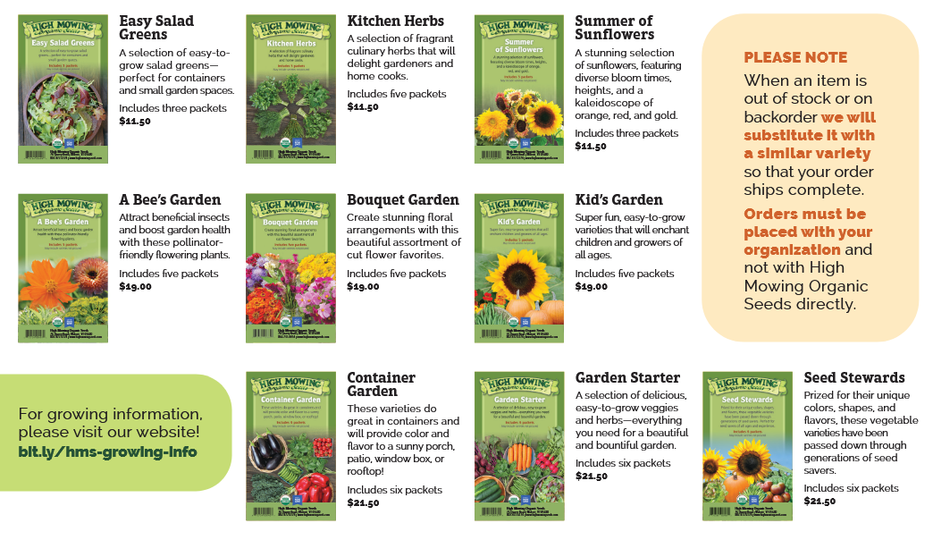 Order seeds with us by March 9th, pick them up or look for shipment of them by once we receive them from High Mowing (we’ll let you know!), and help fund our projects in the process!